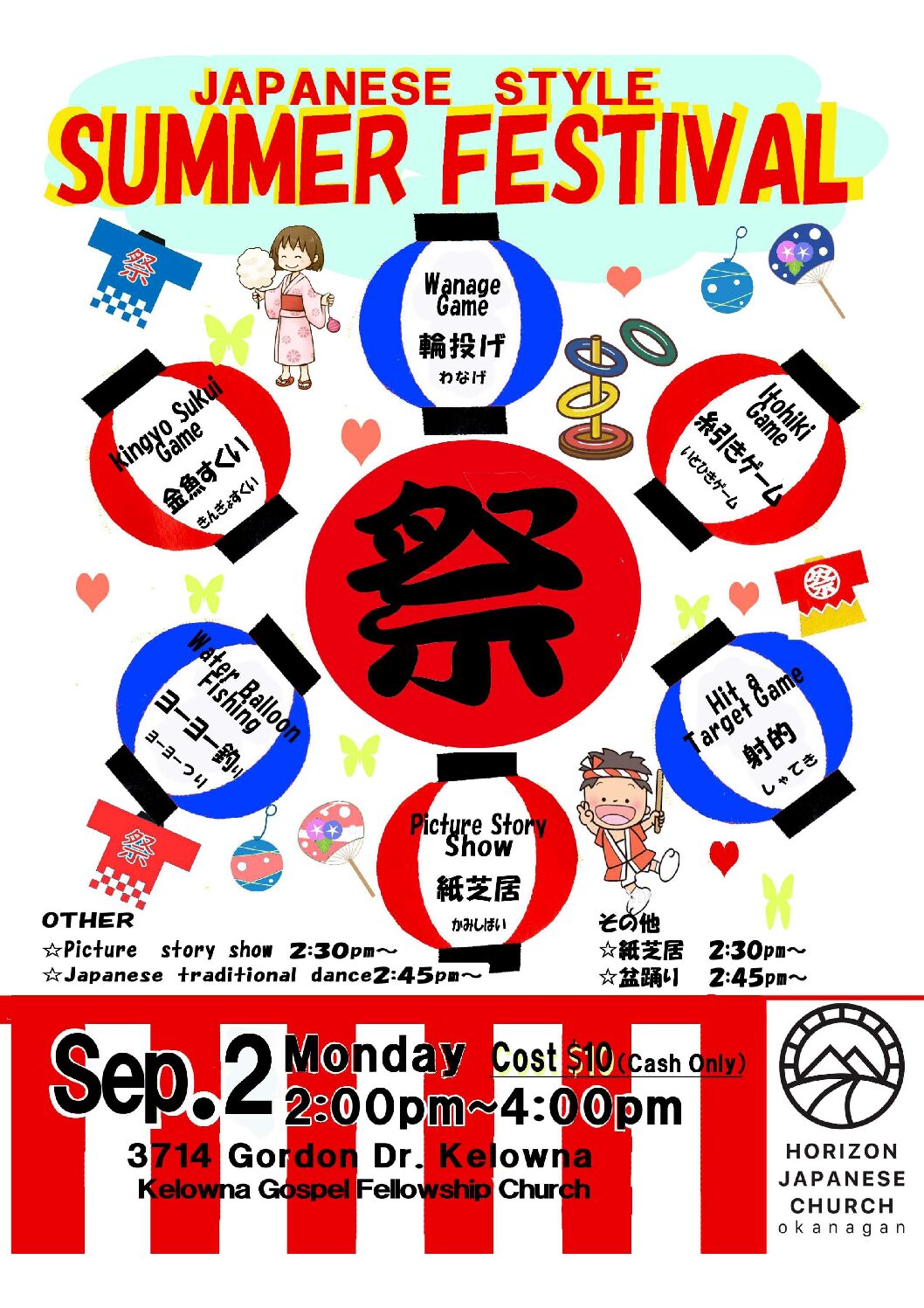 ホライズン日本人教会は、9月2日に夏祭りを開催します。懐かしい日本の夏祭り、全ての子供達の参加を歓迎します!日本は素晴らしい文化を持っています。それをケロウナの人々に紹介したいと願っています!今年は盆踊りを踊ります。